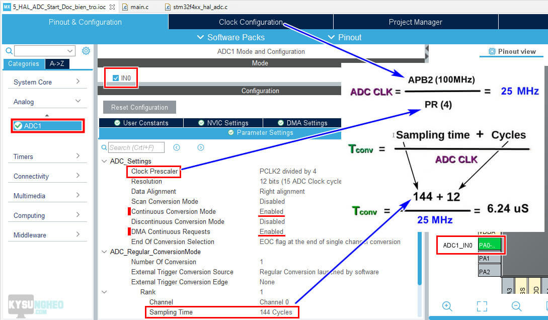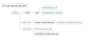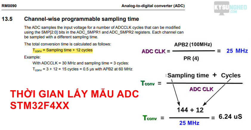 Trong ví dụ này ta chọn xung nhịp 100MHz, sampling time 144 suy ra chu kỳ lấy mẫu là 6.24µs.