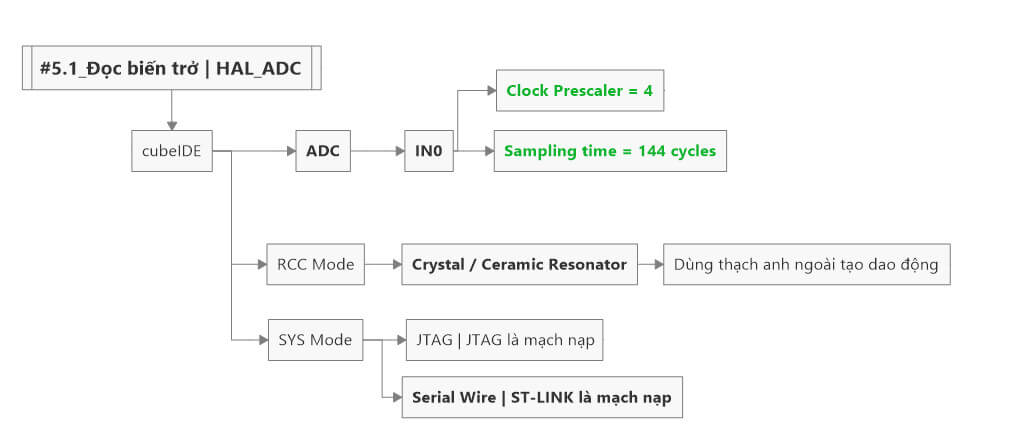 Dao động và mạch nạp như cũ, tiếp theo sẽ là cấu hình ADC. Ví dụ này ta sẽ dùng 3 cách để đọc giá trị biển trở.