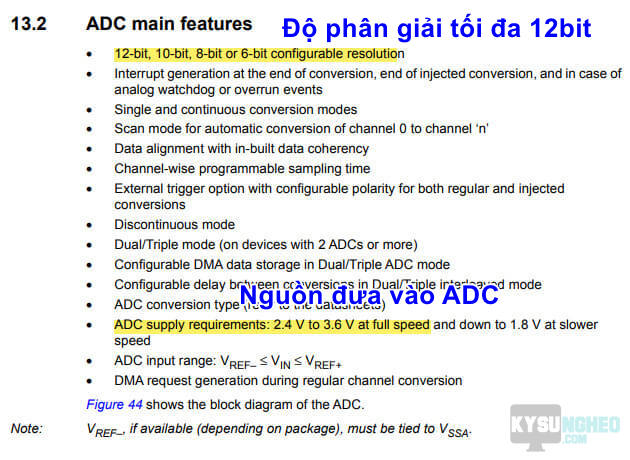 • Dưới đây là 1 số đặc điểm trong datasheet về chức năng ADC trong reference manual. Bộ chuyển đổi tương tự sang số có độ phân giải tối đa 12 bit, nguồn cấp từ 2.4 -> 3.6V. Chu kỳ lấy mẫu Tcon được tính theo công thức tường minh.